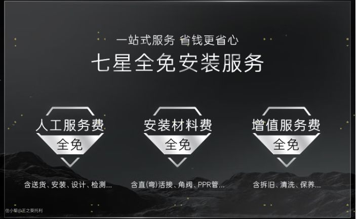 而一些服务质量好的高端品牌,则会提供一站式服务,下图是卡萨帝的七星全面安装服务,免一切安装过程中的人工服务费、材料费和增值服务费等,更加省钱省心省事,给消费者提供贴心服务。
