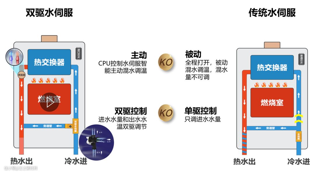 而如何实现恒温输出,解决二次启停的忽冷忽热问题?卡萨帝给出的方案是双驱水伺服,如下图左侧所示。其通过一个双驱水阀门,实现了对旁通管路的水的精准控制。并且增加了三维温度传感系统,配合上双驱调节水量,就能够实现实时精准的换热器出口水温控制了。