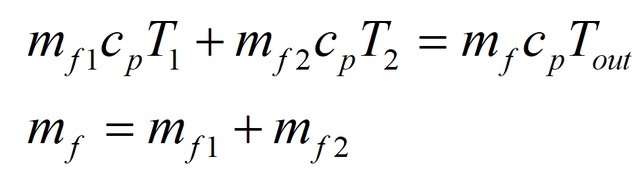 如果你不是很理解为啥这样可以实现水温的精准控制,可以看下面的公式,左侧的mf1是换热器出口的热水流量,T1是出口温度,mf2和T2则分别是旁通管冷水的流量和温度,不考虑过程中的cp变化,在左侧参数都是确定的时候,换热器出口的温度Tout就是恒定的,就是这样实现了恒温。