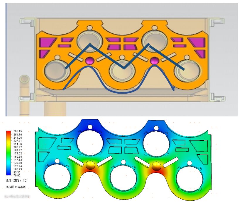 此外换热还与换热器的流道设计有关,下图为最新一代卡萨帝W系列热水器采用的M型高效换热器,以及对应的温度场。该换热器采用“凹”型聚能吸热片结构:让吸热更充分,且有聚能效果;并且采用“M”型交叉热交换结构:可让换热面积更大,让受热更均匀,热水加热稳定均匀,水温稳定。借助于该换热器,使得卡萨帝M系列的整体热效率高达91.5%,更加节能高效。