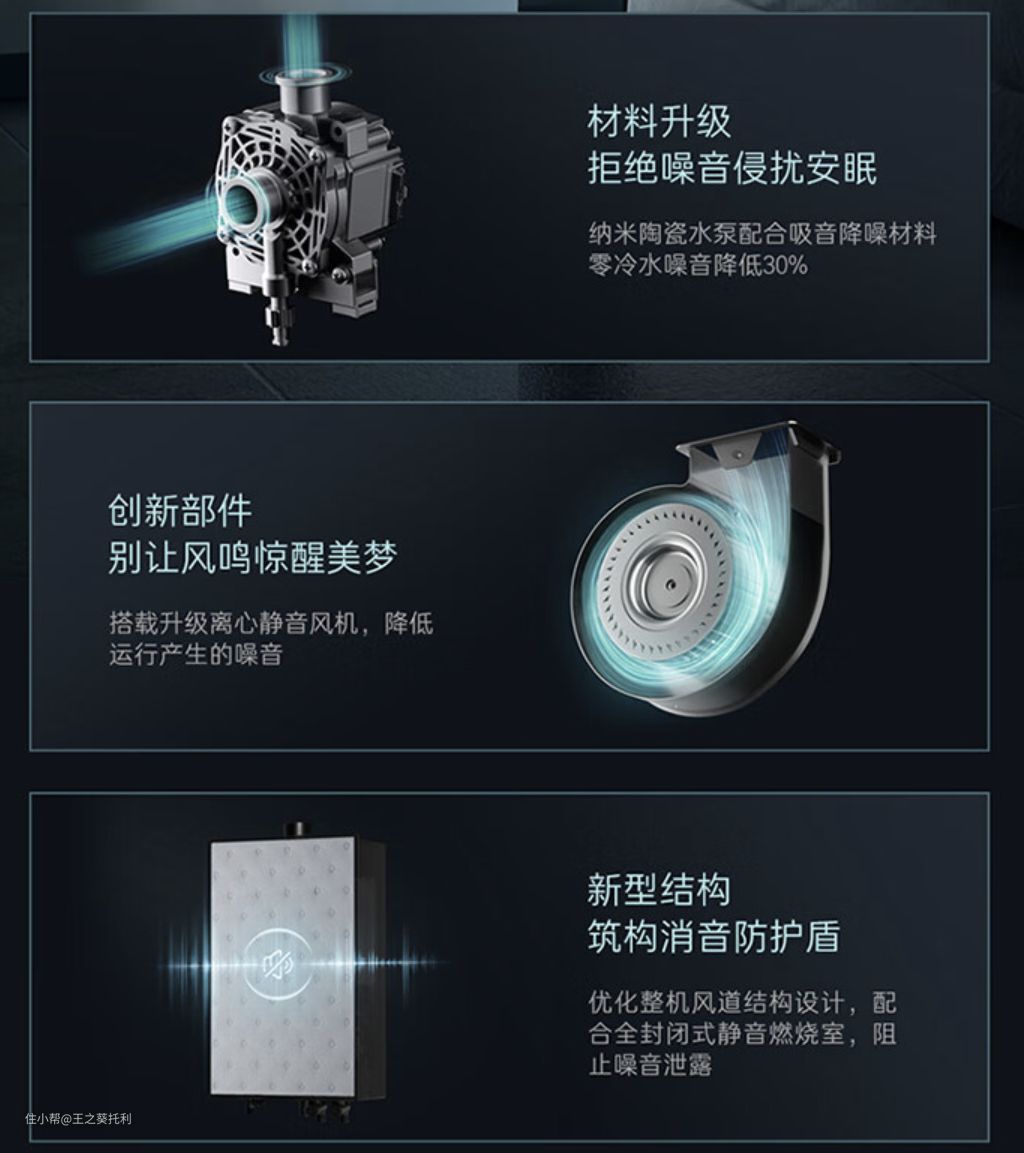 燃气热水器的噪音来自于泵、燃烧室、风机、以及管路。泵的降噪可以通过加吸音材料来实现;燃烧室的降噪通常需要通过隔音来实现;而风机的降噪则与设计有关。下图为海尔卡萨帝CWS燃气热水器中的降噪科技,其通过升级水泵材质,创新离心风机部件,并且采用新型壳体结构来实现。