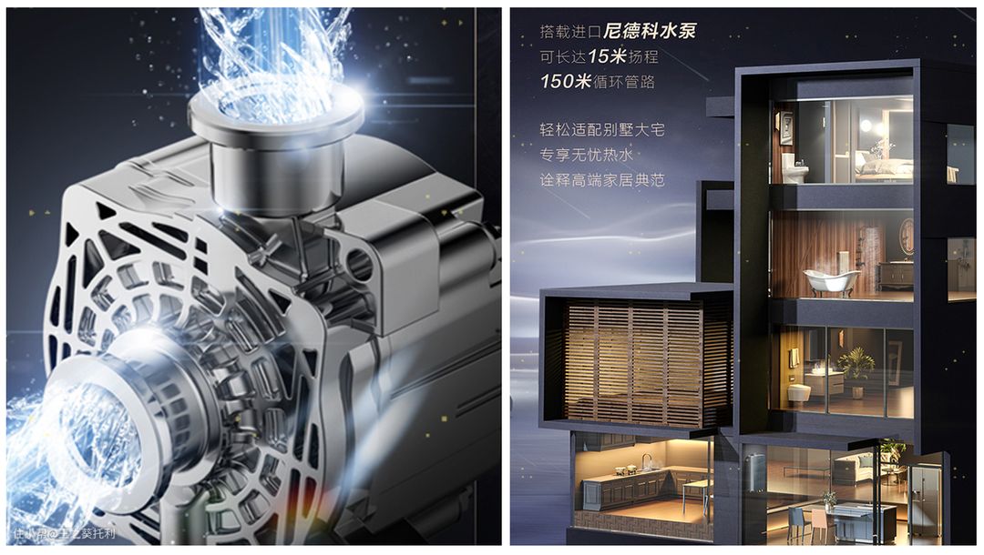 泵的输运能力通常用扬程来表示,下图的卡萨帝燃气热水器W系列中采用的尼德科水泵+turbo涡轮增压技术,扬程可以达到15m,可克服150m的循环管路的压降。超强的输运能力让其可以轻松适配别墅级豪宅,洗浴水量也可增加2.7倍,堪比酒店瀑布洗~能够更好地满足,大户型用户日常对热水的需求。