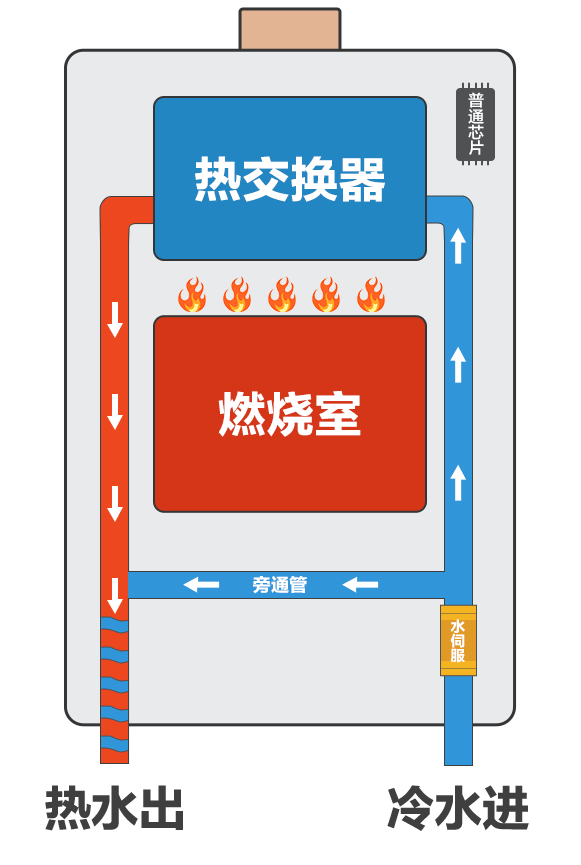 下图为燃气热水器的原理图,从原理图中,可以看出,燃气热水器系统由水管、燃烧室、热交换器、以及右上角的温控芯片等组成。燃气热水器的工作过程,是冷水进入到换热器中,被燃烧室中燃烧的燃气加热的过程。