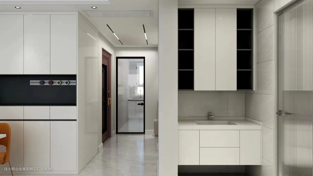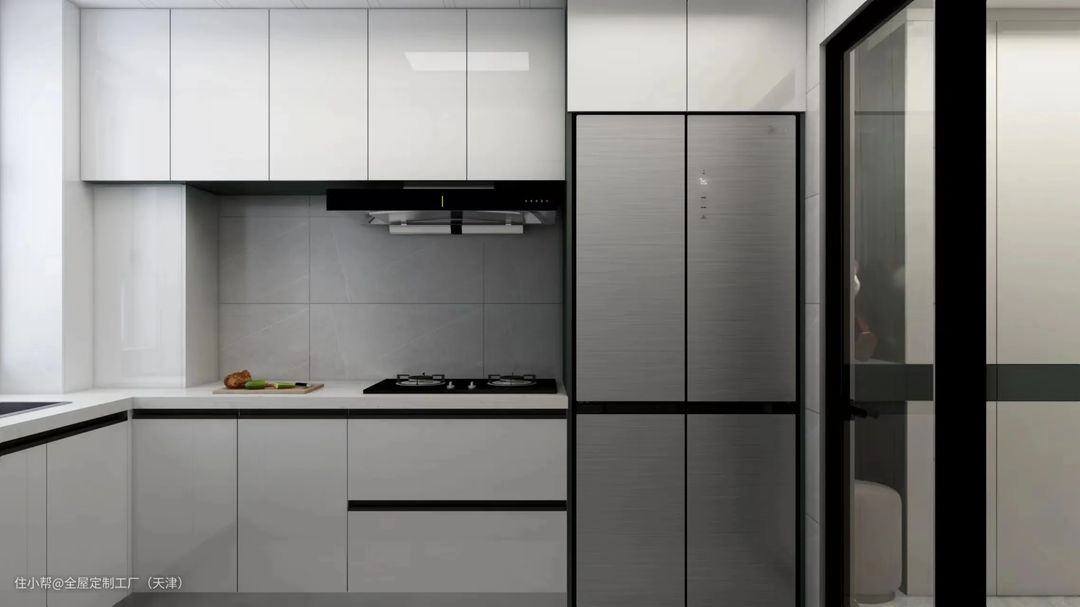 厨房很小,做了L型橱柜,整体采用白色,视觉明朗,冰箱放在了厨房,方便拿取。