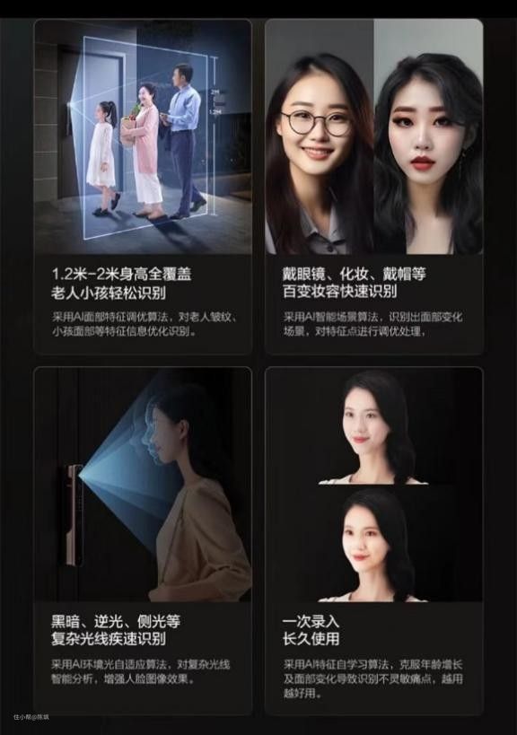 同时因为白天夜晚的复杂光线问题也能够被实时学习并且进化,甚至我们随着年龄的增长智能门锁也能够每一天陪着你慢慢变老,毕竟,如果我们不搬家的话,一把门锁会陪伴我们很多年。