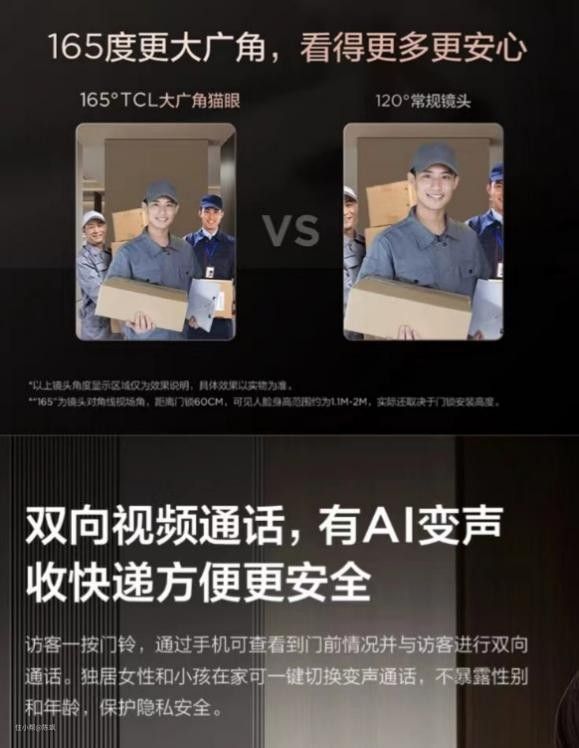 对比传统猫眼功能更加完善,其165度的大广角要比传统120度镜头覆盖面更广,杜绝有人藏在摄头死角的问题,还能够实现24小时主动检测,只要有人逗留便可及时抓拍视频并推送到用户手机,就算你不在家也可以通过手机与对方直接进行双向通话,非常方便。