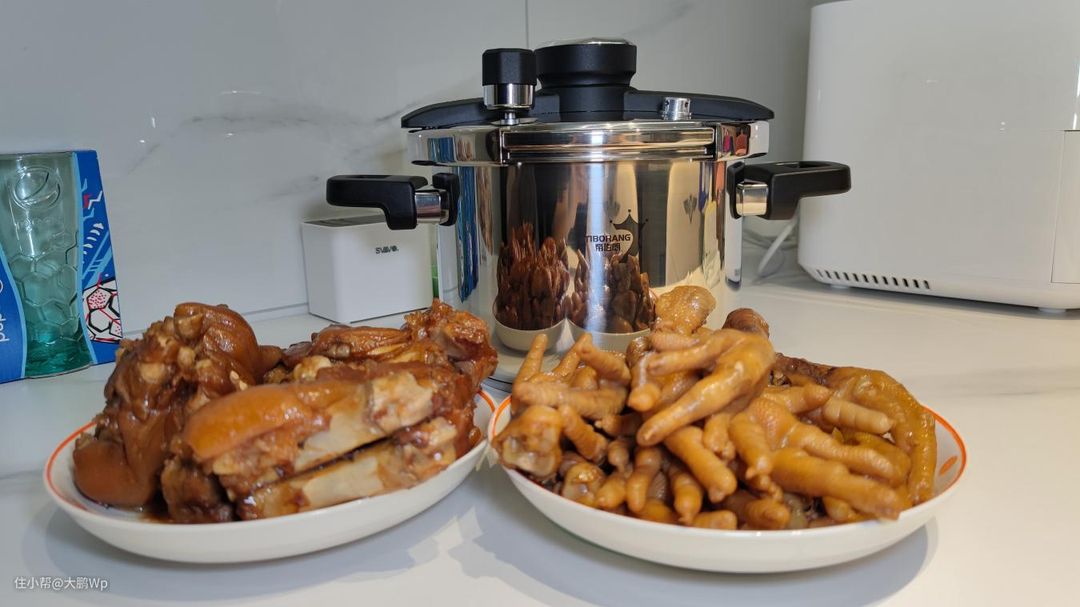 这款压力锅的使用方法跟大家分享一下,燃气灶为例,放入食材后先用中大火给它烧开,然后转成小火去炖,时间从限压阀开始出气那一刻开始算,如果是猪蹄,用珐琅锅或砂锅去炖一般都要2个小时,而这款压力锅只需要15-20分钟,真的非常节省时间。