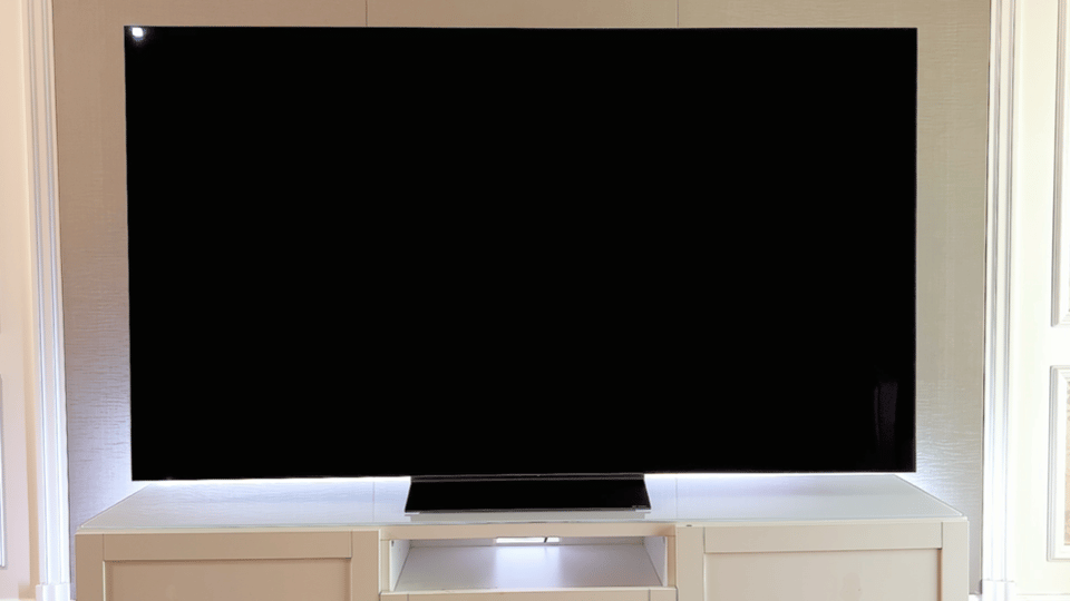 整机的主色调都是黑色,底座是设置在中间的,旁边没有两侧的支架,就像一块巨大的玻璃, 悬浮在电视柜中间,显得非常具有科技感。
