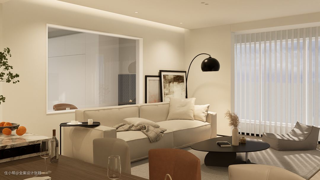 原本的两室一厅,我们在没动户型格局基础上,我们保留了主卧,但将次卧改为了书房,为了使空间通透,我们将书房与客厅的那面墙(非承重墙)重新拆砌,中间以嵌入玻璃,非常适合业主自己在家时无论身处于客厅还是书房时,都能无时无刻的感受到空间被放大拉伸的通透感。