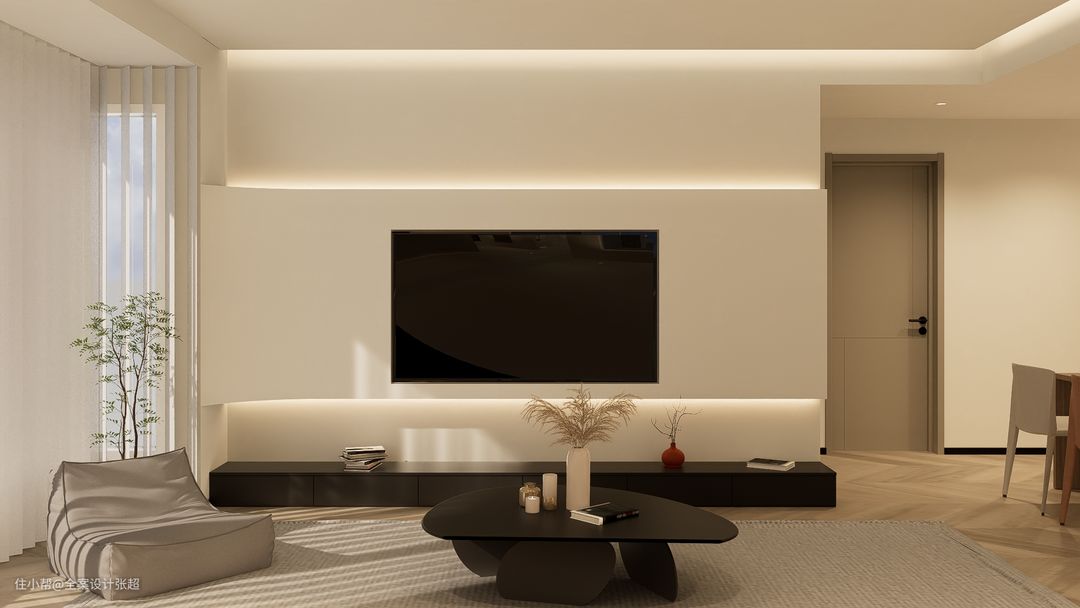 经过多个设计方案的调整后,我们最终决定空间整体的设计上以黑白色极简为主,地面通套采用原木地板铺设,除了在视觉上起到综合作用以外,如果业主喜欢光脚踩实地面的触感,那木地板绝对是触感最佳的不二之选。另外客厅采用的是无主灯设计,但为了保证空间内的照明光亮,我们分别在吊顶、电视背景墙等地方加入的灯带,在夜幕降临时,屋内的灯光亮起时,那份独属于业主的浪漫时光,也会正式开启。