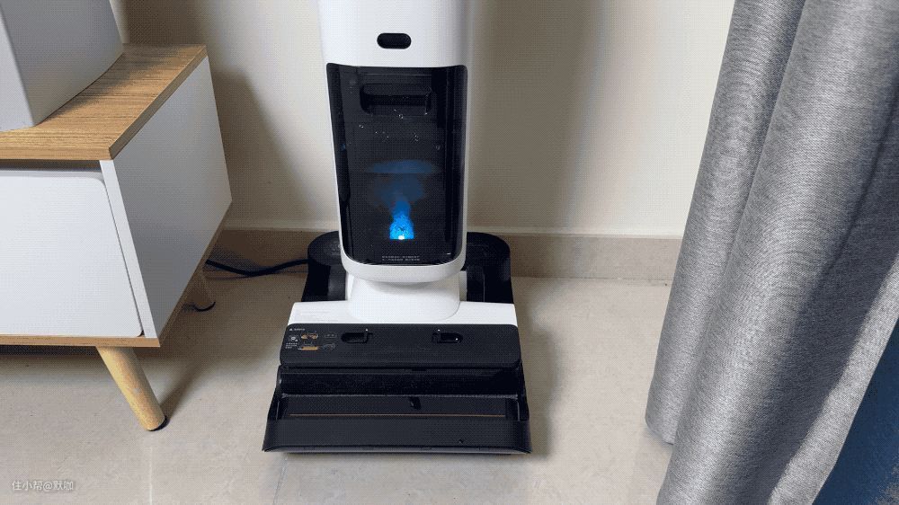 在清洁完成后,最关键的还得看自清洁能力,小米无线洗地机2在自清洁时会释放杀菌水进行深度清洗,搭配正反转和内部梳齿结构,可以来回清洁刮除滚刷上的脏污。清洁完成后,它还会采用50°C的热风进行烘干,等到烘干完成,取下滚刷,用纸巾贴上测试,可以看到足够干爽,一点水汽残留都没有。