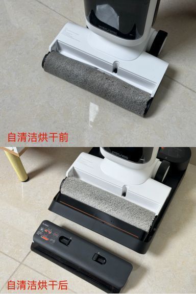 自清洁完成后可以看出前后对比,自清洁前滚刷有明显污渍也更加湿润,自清洁完成并且烘干后,非常干净而且没有一点水分,非常干。