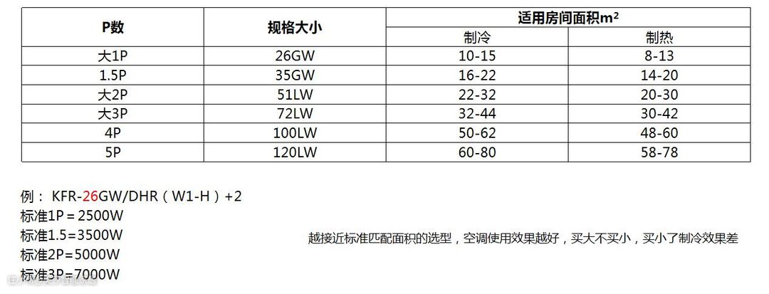 根据房间面积来选择空调时,一般可按照每平方米150W制冷量计算。当然也可以小空间选择大匹数,但是不建议大空间选择小匹数,不仅制冷慢,而且能耗也会更高。