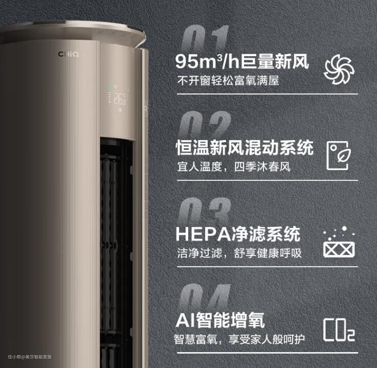 3匹圆柱式空调,外观颜值高,放在客厅吸睛好看,彰显品位。95m³/h巨量富氧新风,即便是不开窗,也可以实现富氧满屋,呵护呼吸健康。而且送出的是恒温新风,室内四季如沐春风,倍感舒适。它还可以语音智控,解放双手,体验便捷智能。新一级能效4.38,用着更省电。