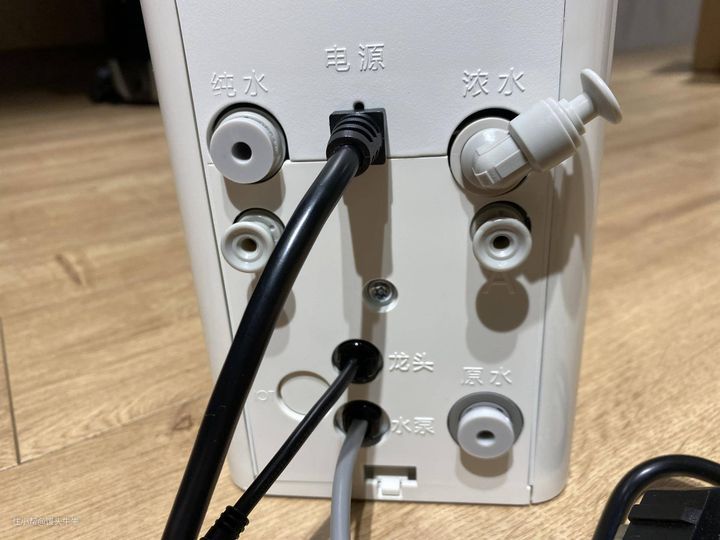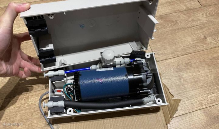 那在这个角度看的话,底部的一些电路电线还有管道水路,它的结构是能够看到一部分的,所以整个机器的话。这样的结构的设计还是比较简单清晰的,这个时候就会有同学有疑问了,电路板和水管也看到了。那么这个机器不是ro反渗透的吗?它不需要加压泵吗? OK,这这也是馒头牛牛一开始看到配件的时候在思考的一个事情。