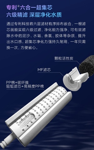 这滤芯有点东西,说起来是6合一的超集芯(不是超级芯),市面上独一档,专利肯定是有的。集成滤芯这东西,是行业的发展趋势,一来缩小了产品体积,二来,对用户是节约后续的换芯数量和成本。