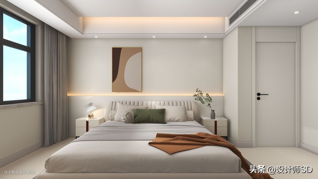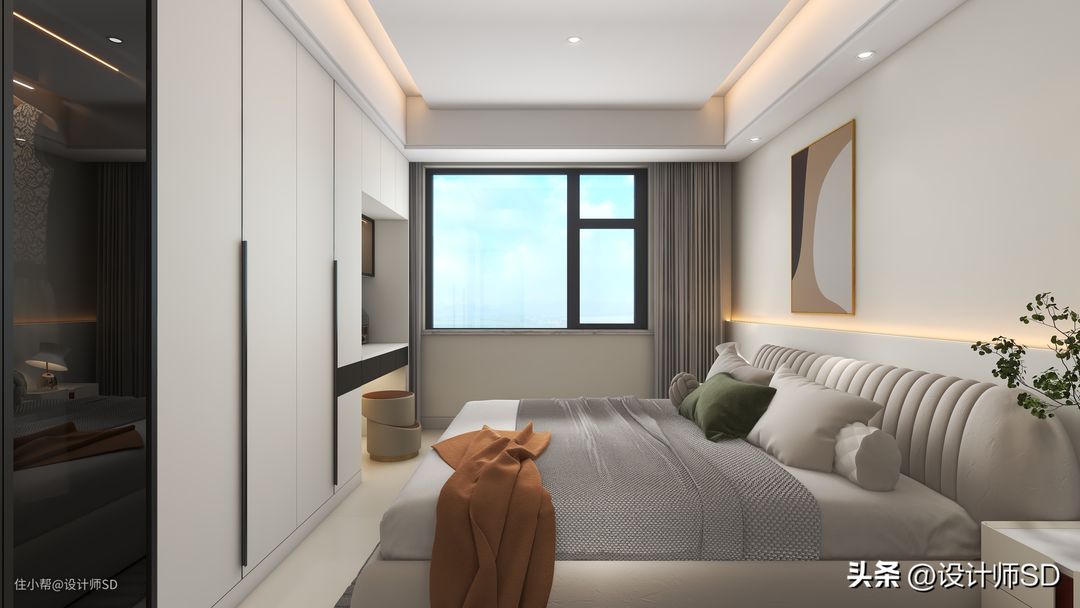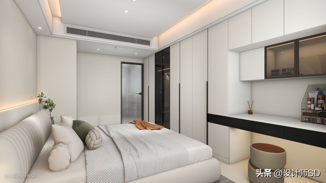 “顶面”做了简约的造型吊顶,在四周做了一圈边吊,在房门过道的顶面位置安装了风管机的空调,这样看起来卧室的中间形成了一个整体,同时搭配了双眼皮的造型感。