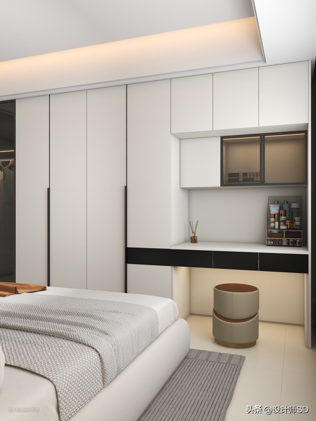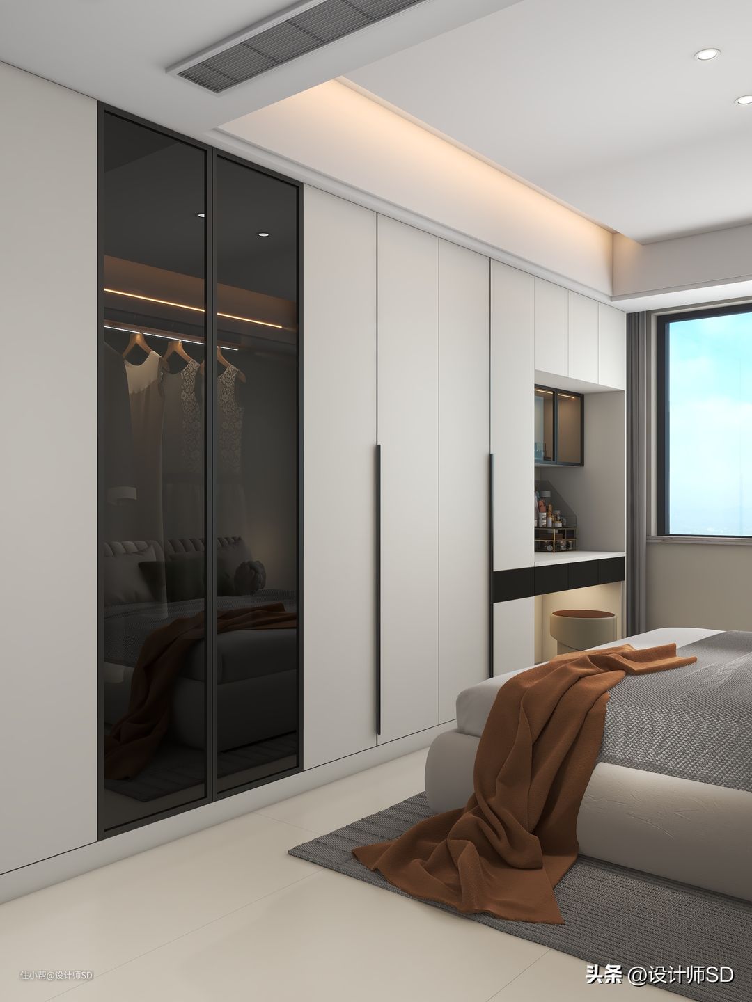 在梳妆台的上柜,做了三门跟衣柜齐平的柜体,可以放置棉被类的大件储物空间,下方还安装了两扇黑框玻璃门板,放些精致的装饰品摆件,都让偌大的衣柜显得精致实用又漂亮。