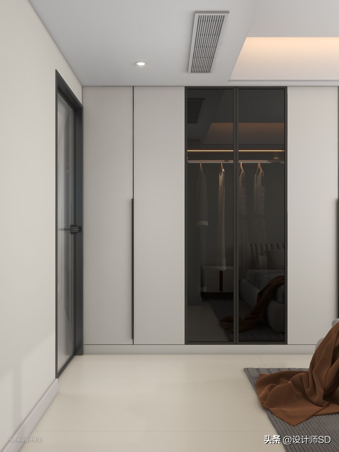 一起分配了11门的布置,在左侧做了两扇一门到顶的衣柜,柜体跟门板同色,一门到顶的造型搭配了黑色的封边拉手,看上去实用又美观。