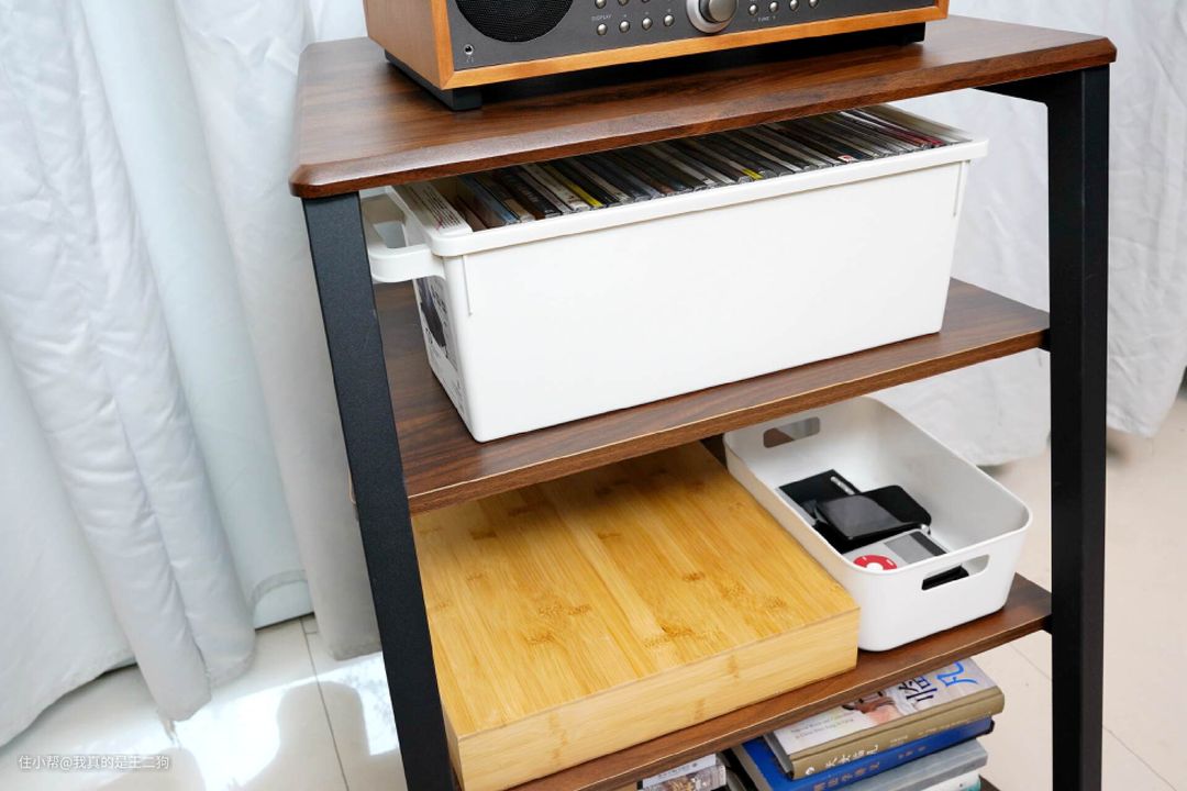 影音柜采用了胡桃木纹储物搁板+黑色钢材方管设计,外观设计高贵典雅和音乐设备能够很好的搭配。四层储物搁板支撑的最大重量上有差,上下两层最高承重为50Kg,中间两层最高承重为20Kg。这个承重水平应对日常使用绰绰有余,不过考虑到使用的协调和稳定还是在存放物品上进行了一定优化。考虑使用方便将桌面音箱放在了顶层搁板,中间两层则是放置总量相对较轻的随身HIFI设备和CD,底层则放置拿取频次较低同时也比较重的图书。