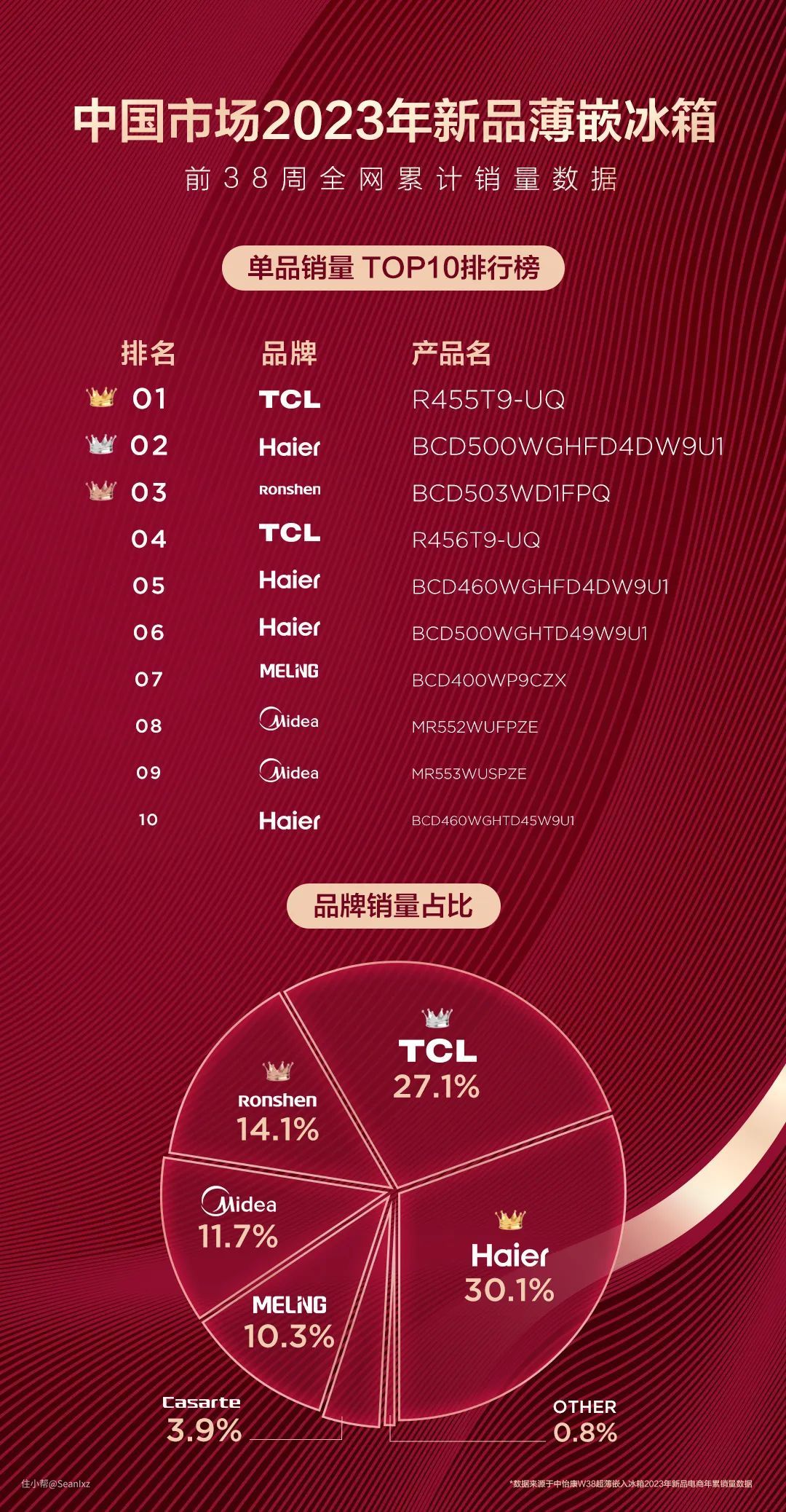 市场占有率方面,各家都有自己的明星产品,其中TCL凭借薄嵌冰箱T9一款产品的两个配色占据了最大份额,海尔则有更多的容量款式可供选择,各家都实力不俗。今天就来安利下销量排名前三的薄嵌冰箱。
