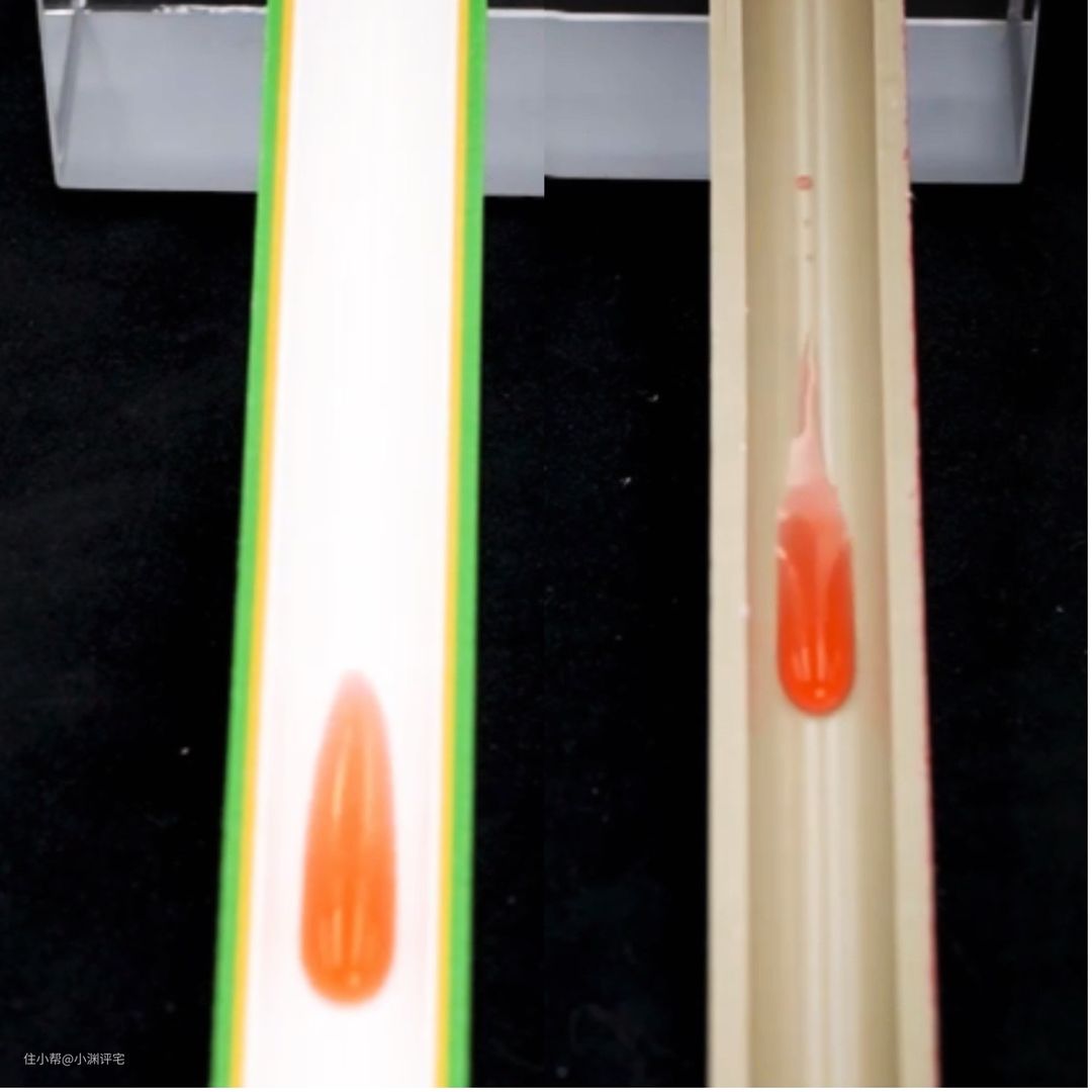 如上图,联塑仿生自洁抗垢PPR管的内壁有一层仿“荷叶效应”的疏水层,水流过后不会悬挂在内壁上。右侧那根普通水管内壁就挂上了几滴水,水干涸后就会留下水垢。天长日久的堆积,会导致管道被水垢堵住。
