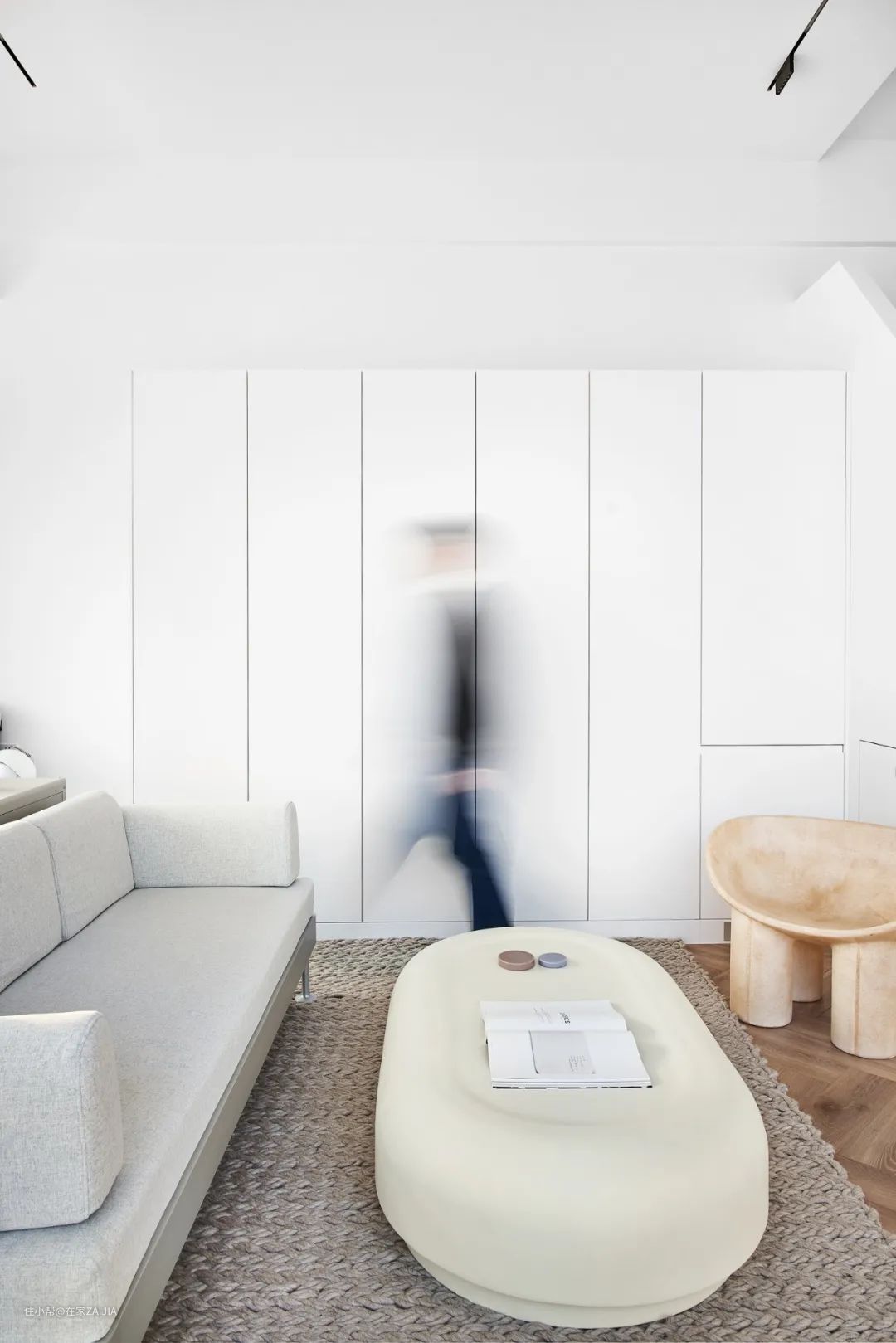 沙发左侧还定制了一整墙的白色柜体,将衣柜和客厅储物整合起来,柜门采用了隐形设计,让柜子像白墙一样得以视觉延伸。