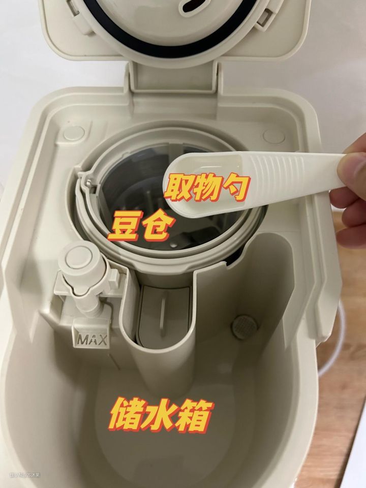 咖啡机顶部打开是豆仓和储水箱。豆仓内部结构简单实用,呈圆柱状,可容纳35g咖啡豆。同时赠送了取物勺。 储水箱容量为550ml,储水箱具有可视度水尺无需额外使用量杯,储水箱不能与机体分离,注水方式为直接注水。 操作起来非常简单,小白也能轻易上手。