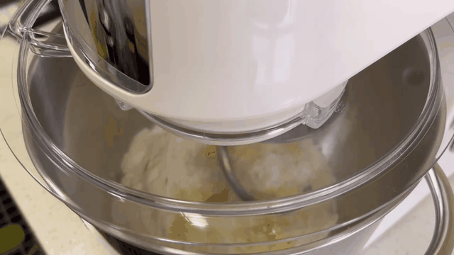 因为有企鹅顶顶在,所以第一步相当简单:只要给企鹅顶顶装上S形面钩,再将配方中除黄油外的全部配料一股脑倒进去,开动厨师机即可。