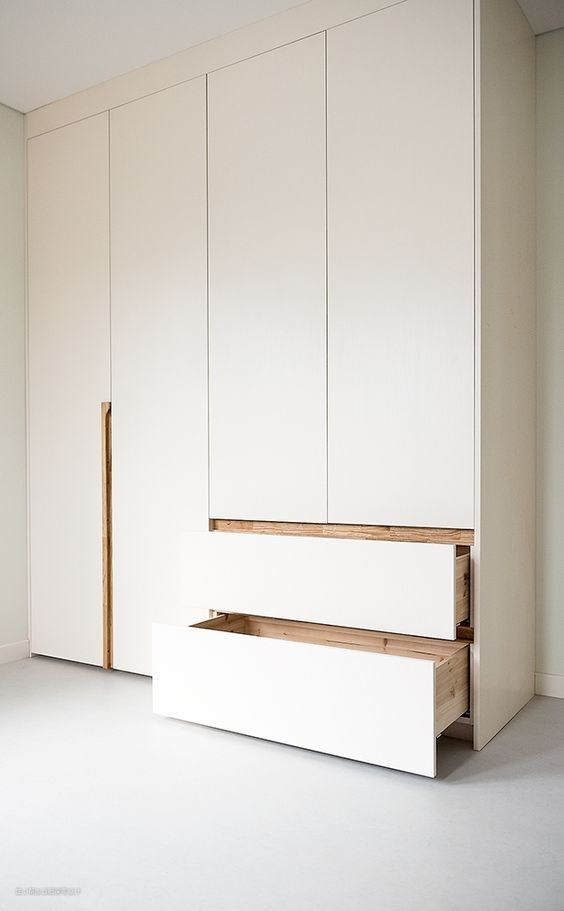 衣柜没必要一味追求高柜,整个柜门要大板不仅费钱,还容易增加对五金件的承重,影响利用率,时间一长就会发现柜门变形,即便装了拉直器也不能一劳永逸,根据下图将抽屉外置后,柜门分层就能大大解决上述的忧虑。