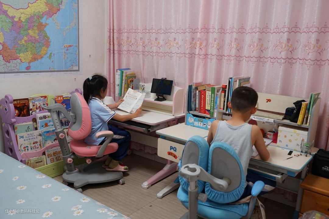 另外,还有一个小插曲,我家两个孩子性格迥然,女儿文静、儿子淘气,以前两个人各占一个卧室学习和上网课,但老婆辅导起来极不方便。后来就搬到了一个卧室并排摆放两个孩子的学习桌,结果是女儿自控力强做作业也快,边写边听故事都能把作业做完;儿子作业多,自控力差,每次听见妹妹听故事或者看动画片就围过来要一起看。