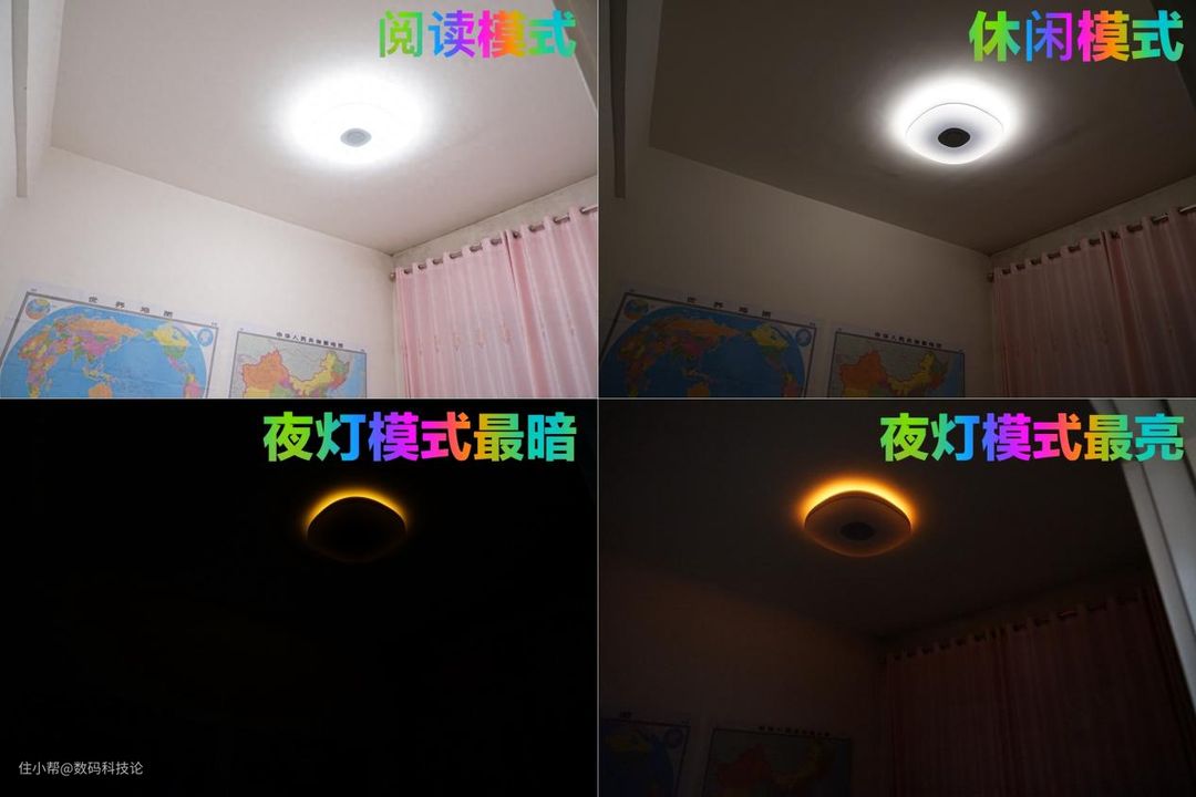 而且还有多种智能模式可选,有全灯模式、阅读模式、休闲模式、夜间模式四种预设照明模式,并支持色温智能调节、亮度自适应,以及APP、智能语音、无线遥控等多种控制模式。
