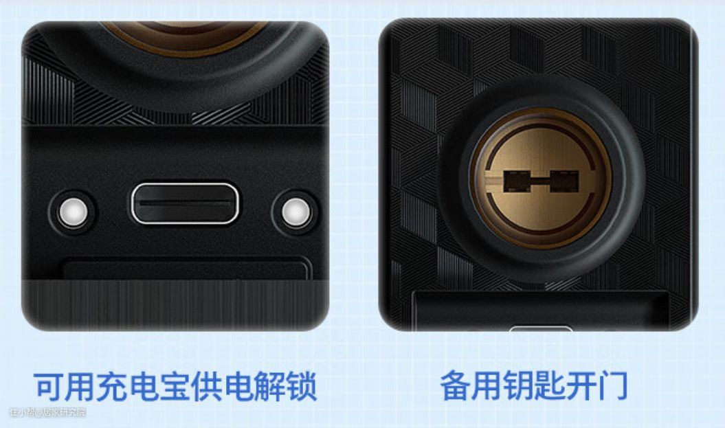 智能门锁除了通电时可以使用的指纹、密码、人脸识别、远程控制开锁等方式以外,在遇到没电的时候,还可以有这3种开锁方式: