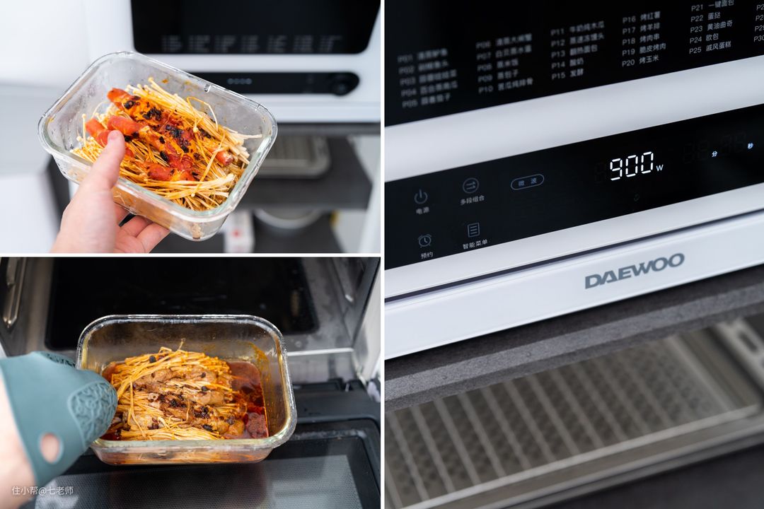 自用的大宇微蒸烤炸一体机9档变频微波可调节,能满足不同食材和菜品的需求,我会使用低功率软化解冻食材,比如晚上解冻鸡腿肉或冻鱼,将食材放入盘中,可以自己调节功率,也可以直接选择自动菜单中的P31全解冻肉类,也可以选择P30半解冻,半解冻的肉比较容易切薄片。