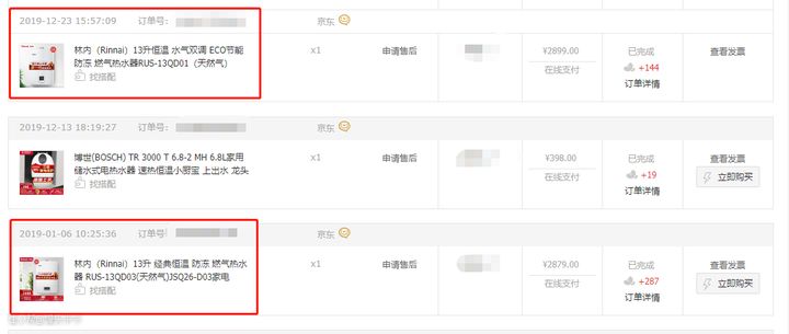 住了半年左右,热水器直接罢工报废了,也懒得和房东争吵,自己掏钱买一个好点的,当时就咬咬牙在东哥家下单一个3000多的林内,等着发货安装。那时候工资也就小几千,3000买热水器真的很奢侈了。就是这款: