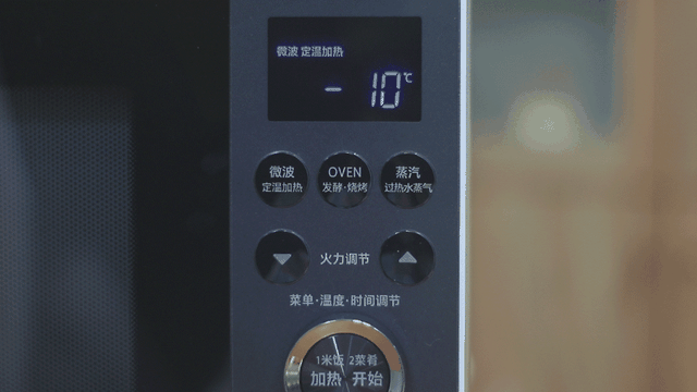 前面这种模式需要你的牛奶一杯在200ml左右,另一个方法不用考虑加热容量,只需要直观的选择加热温度就可以。切换到微波定温加热,旋钮可以直接在-10℃~90℃之间调节,家里人喝常温奶容易度肚子不舒服,接近60度的他觉得热,所以这里我就直接精准调节到45度,同样比传统微波设置火力+时间来得直观。