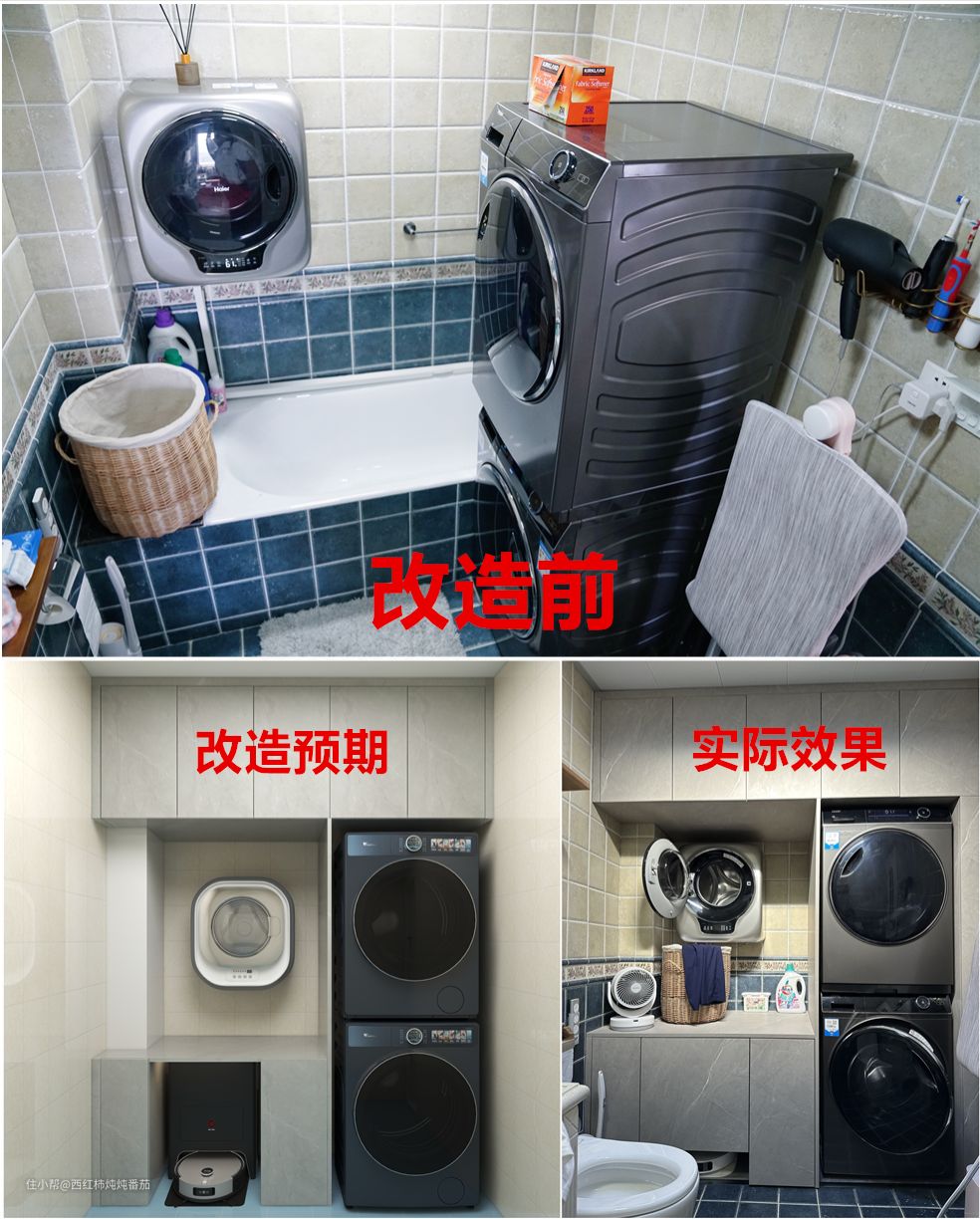 其中主卫重装后拆除了吃灰已久的浴缸,给用了两年多的海尔纤美176套装做了个专门的柜子,还给扫地机专门做了个「窝」,上面正好再挂一台壁挂洗衣机,卫生间一下子整洁很多 ▲