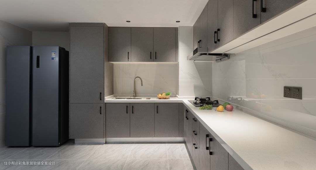 厨房用深灰色调的橱柜,搭配白色云纹墙砖,与白色吊顶,简洁大方。