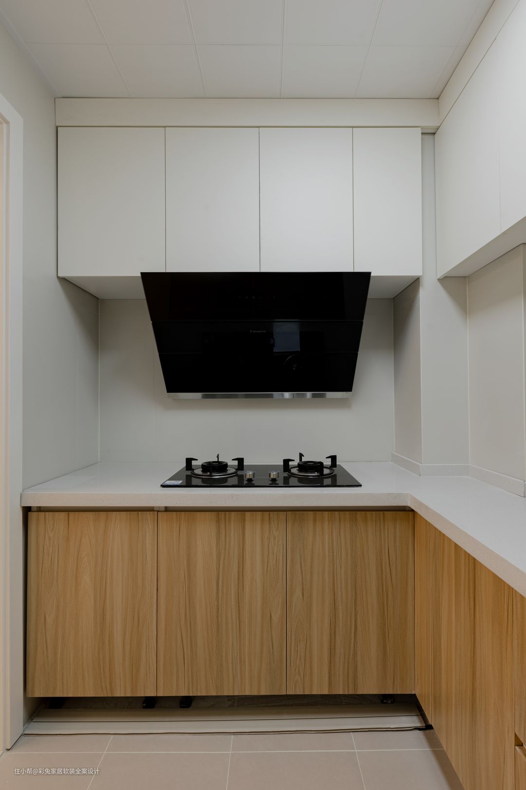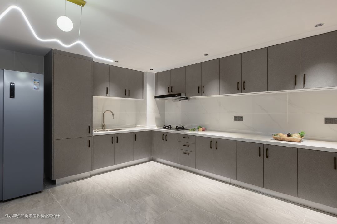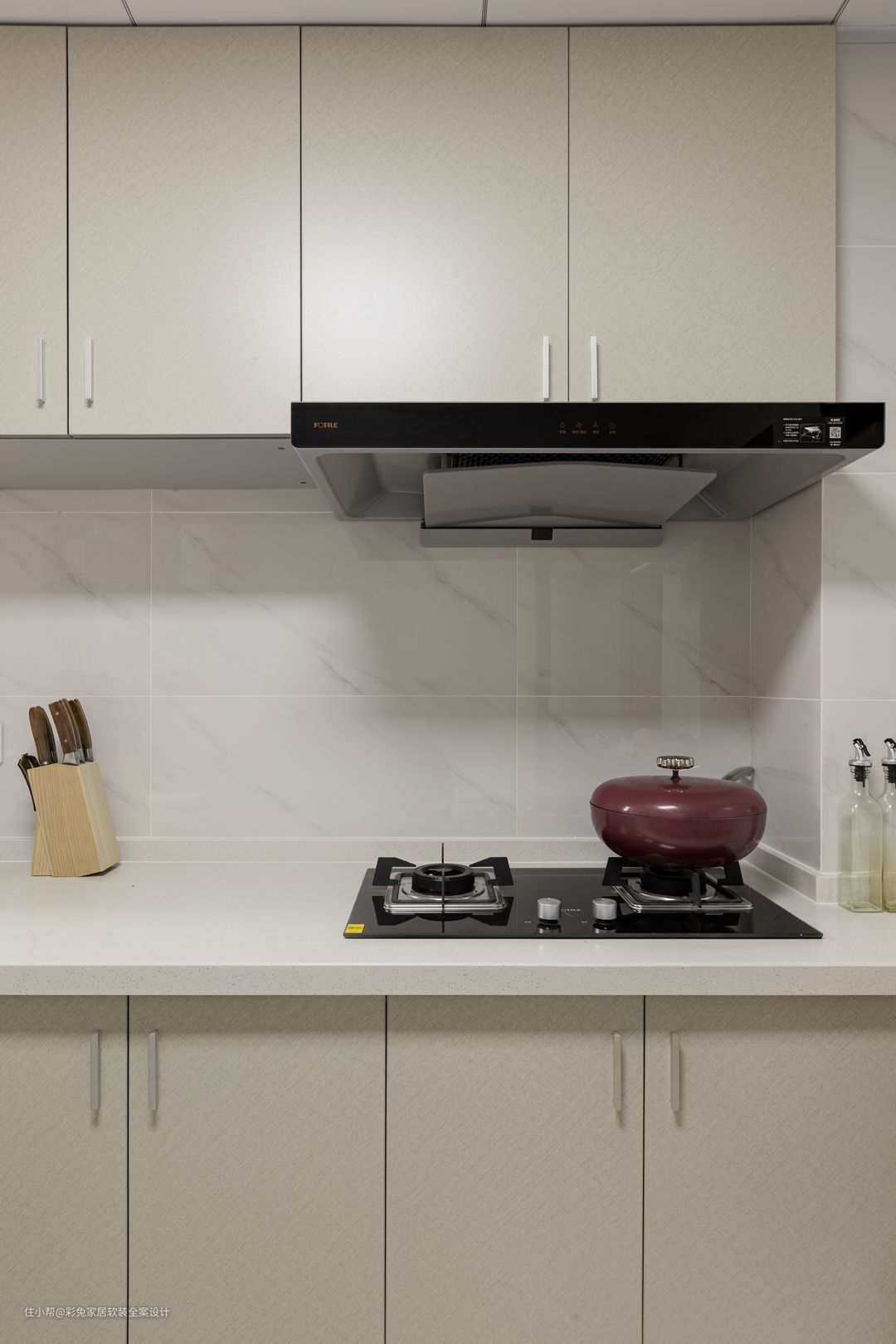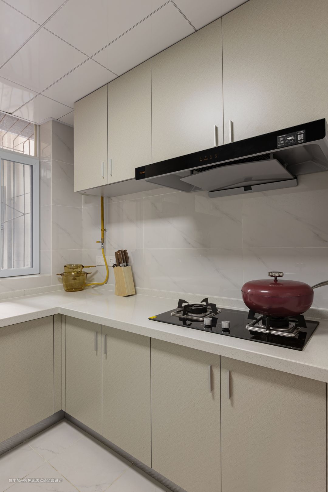 厨房通铺白色云纹地砖和墙砖,搭配白色铝扣板吊顶,营造一个明亮整洁的背景。橱柜面板选浅色调,在白色主调衬托下,更显清晰美观。