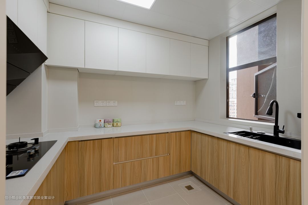 橱柜u型布局,充分利用空间,白色石英石材质的台面,表面坚硬光洁,经久耐用。搭配黑色水槽、黑色烟机灶具,对比鲜明让家看上去更整洁。