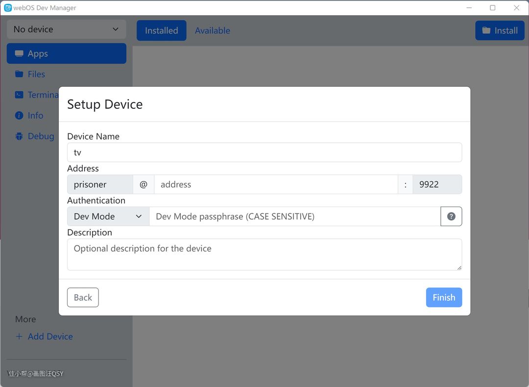 这里会要求填入电视的地址以及下方的数字,就是Developer Mode显示的那些addres和passphrase。