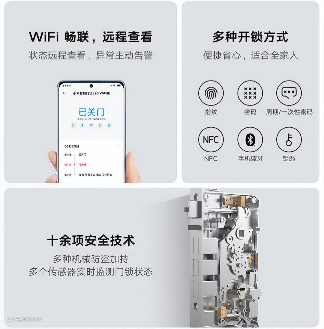 这款小米最新上线的小米智能门锁E20 wifi版是一款半自动智能门锁,不同于以往小米智能门锁需要蓝牙网关接入米家app应用,它新增了wifi直连的组网方式,可选蓝牙或wifi两种协议进行组网。