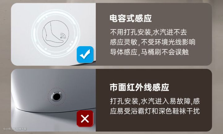“电容感应”是利用电容感应原理,通过检测人体对电场的影响,来触发马桶盖的开启或翻圈,这种感应方式更灵敏一些,脚碰到马桶才会翻盖,对过道偏窄的小卫生间就更加友好了。