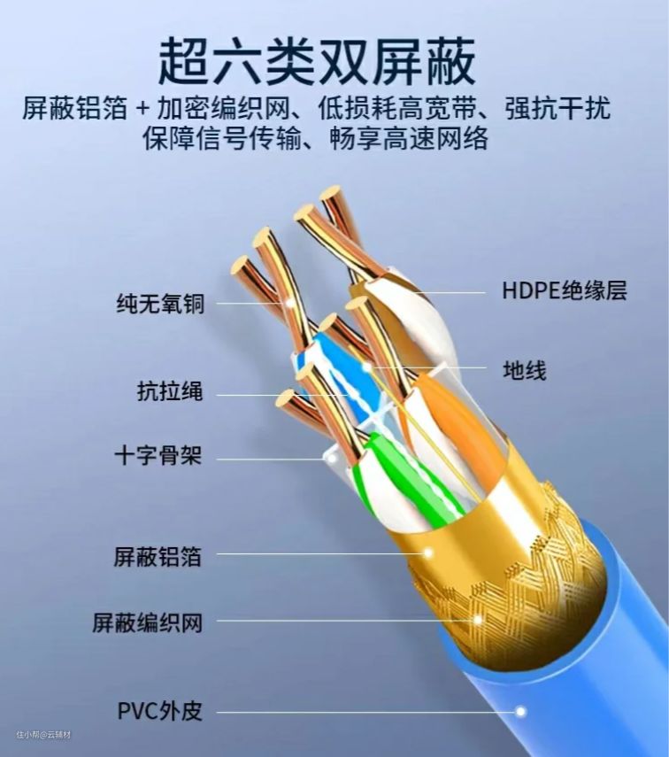 七类网线:最新的一种屏蔽双绞线,七类的线芯是 0.57mm 左右的铜线,是高纯度的无氧铜,这能保证超低电阻,从而能传输更远,更稳定。