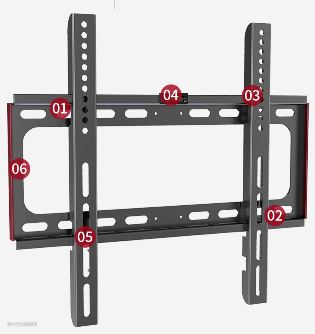 注意到这些密集的孔位了没?可以通过更换孔位来实现对电视挂载高度的精确调节。注意这个弯出来小钩子,电视就是利用它挂在支架结构件上的。