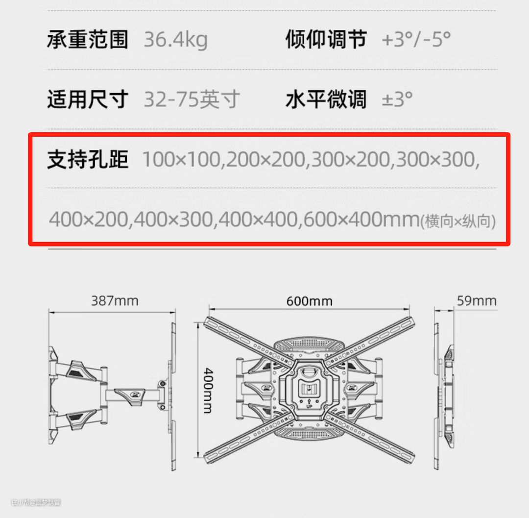 例如,我家电视是索尼55寸8566D,经测量挂载孔距为20*20cm,可以适配上图中孔距范围为40*40cm的挂架。