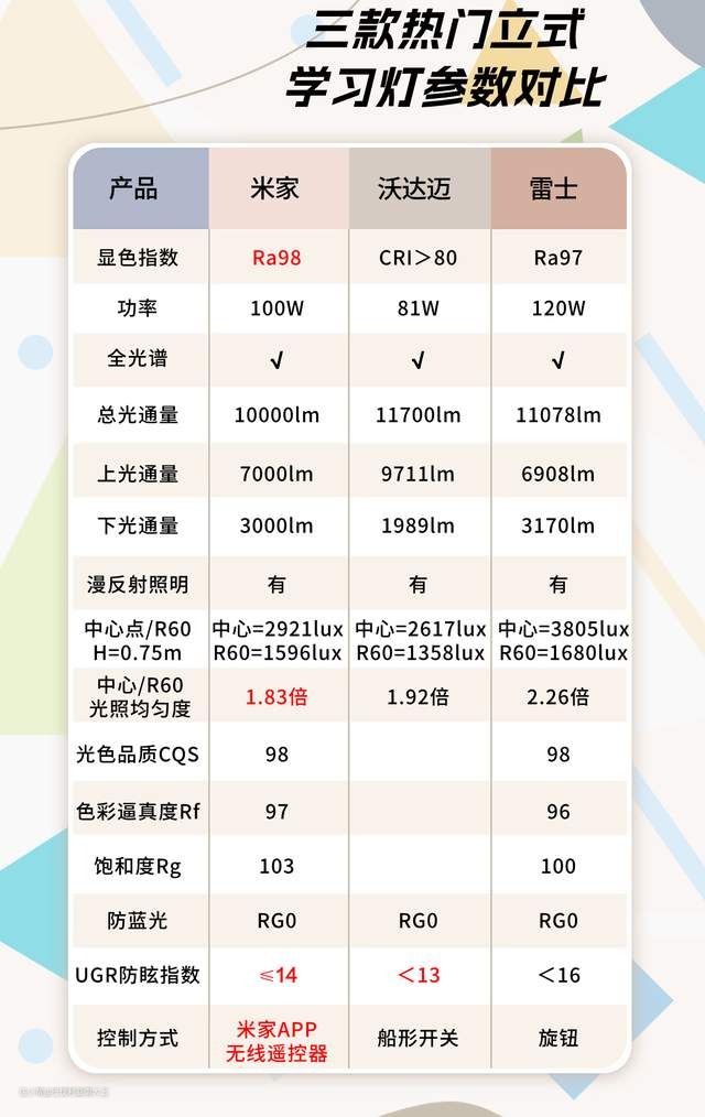 其中显色指数方面,米家和雷士以Ra计,均超过95,属于优秀灯具。沃达迈则采用了CRI的计算方式,官方数据为>80。