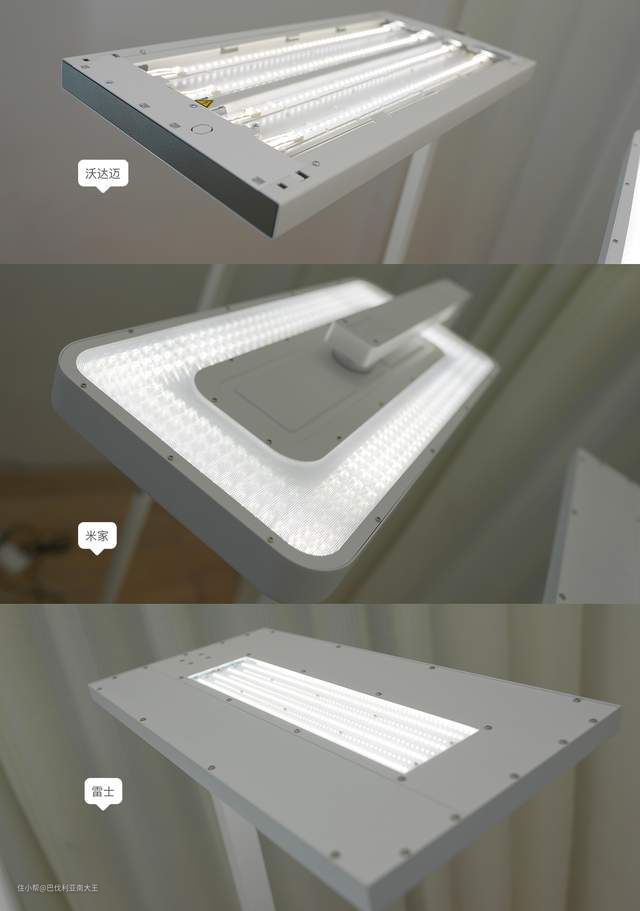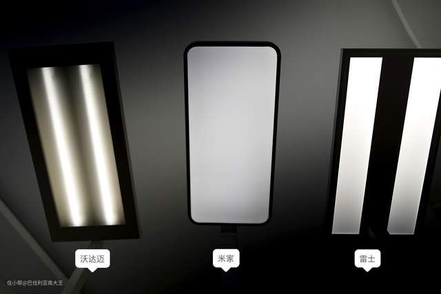 这三家中,沃达迈和米家的上照明分布面积更大,另外只有米家在顶部增加了透镜+扩散板结构。而沃达迈和雷士则是采用了灯珠直接照射天花板的方式。在顶部照明这样“看不见的地方”米家的做工成本更高,有了透镜和扩散板的加入,让照明的均匀度进一步提升了。