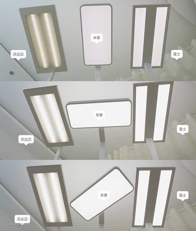下面就来实际对比在灯光下的眩光情况,可以看看灯具下方扇叶的棱角高光等位置的具体表现。用肉眼来看沃达迈和米家属于柔和风格,雷士则有一些锐利。