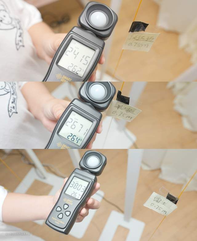 接下来再测一下,H0.75m R30cm的数值,也就是距离灯具0.75m,距离中心点30cm距离的照度如何。沃达迈是1971Lux,米家是2395Lux,雷士是2848Lux。